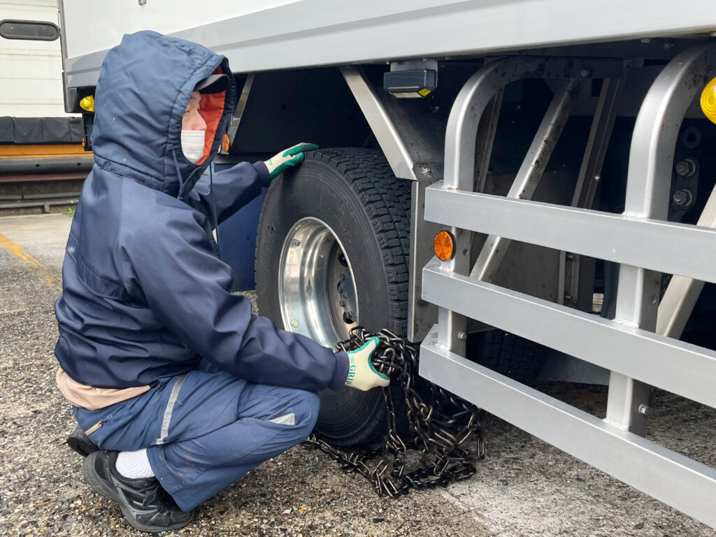 実技では、タイヤチェーンの正 しい巻き方を学び、実際にトラックに装着することで、冬季における走行時の安全対策を強化しました。今回の研修内容は各事業所へも展開する予定です。