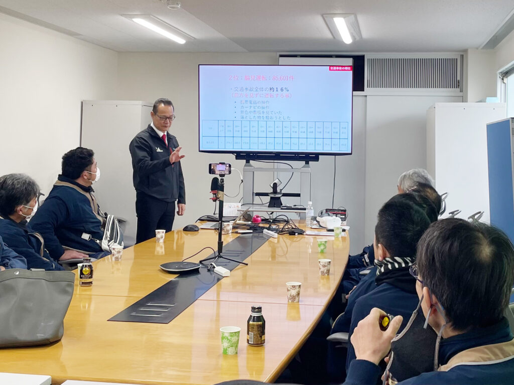 座学では、安全運転の基本をはじめ、出発前・帰社後の点検方法や事故事例の共有を通じて、安全確認の重要性を再認識する機会となりました。